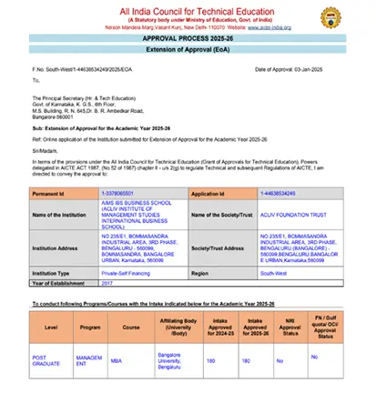 AIMS IBS is approved by the All India Council for Technical Education (AICTE), Government of India, ensuring that our programs meet the highest standards of quality, relevance, and compliance. Our institution operates within the frameworks and guidelines set by regulatory authorities, giving students the confidence of a recognized and credible education.